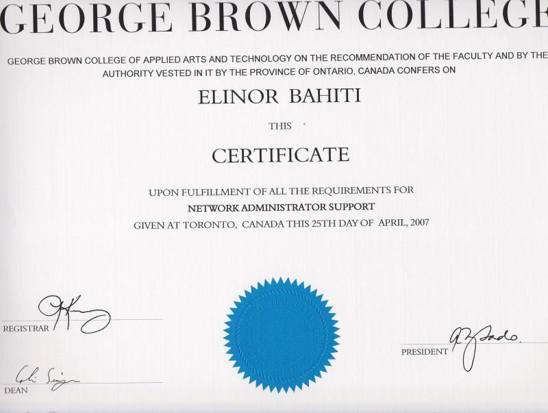 - Network Administration Support Certificate from George Brown College (2006-2007): Emphasized computer hardware maintenance, operating systems troubleshooting, and network management.