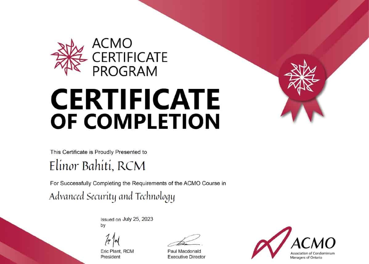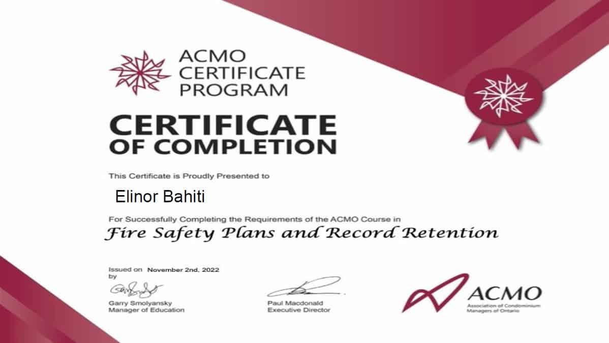 Additionally, Elinor has obtained certifications in advanced ethics, communication and conflict management, managing new builds and Tarion, advanced financials, security and technology, fire safety and records, and advanced plumbing and water management. These qualifications underscore his commitment to professional development and excellence in condominium management.